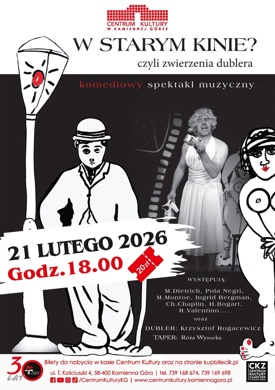 KAMIENNA GÓRA. Centrum Kultury zaprasza na komediowy spektakl muzyczny pt. „W starym kinie? czyli zwierzenia dublera”. Wydarzenie odbędzie się 21 lutego 2026 roku o godz. 18:00. To sceniczna podróż do świata dawnego kina – z humorem, muzyką i charakterystycznymi postaciami złotej ery filmu. W spektaklu pojawią się nawiązania do ikon światowego kina, takich jak Marlene Dietrich, Pola Negri, Marilyn Monroe, Ingrid…