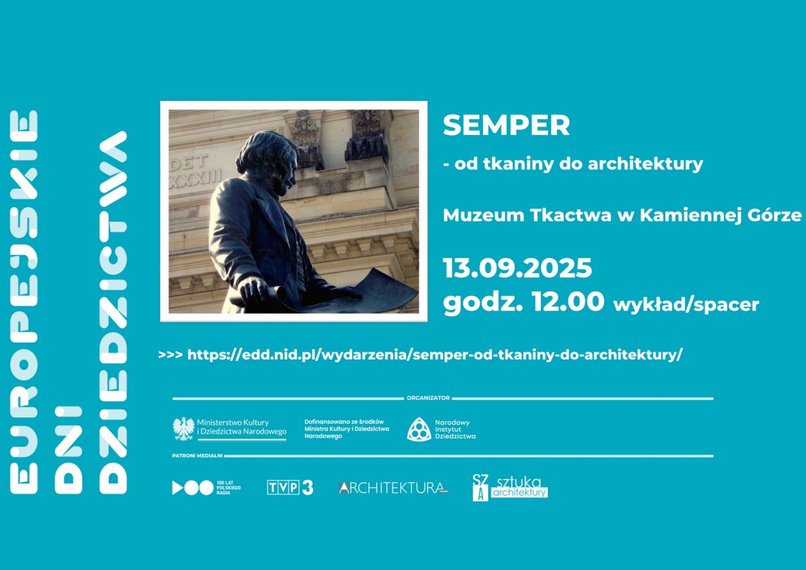 W ramach #EDD Muzeum Tkactwa w Kamiennej Górze zaprasza na wykład i spacer po starym mieście w Kamiennej Górze. Spotkanie będzie dotyczyło wybitnego architekta i teoretyka sztuki – Gottfrieda Sempera, którego rodzina pochodziła z Kamiennej Góry. Wywodzący się z rodu kupców tekstylnych architekt był jednym z pierwszych teoretyków tkaniny artystycznej. Semper przedstawił ideę tekstryny – oddziaływania splotu tkackiego i plecionkarstwa na architekturę, a także teorię stylu fasad jako -„ubioru architektury”. Genezę architektury widział w pierwszych konstrukcjach budowanych z wykorzystaniem tekstyliów (parawany, namioty, jurty).