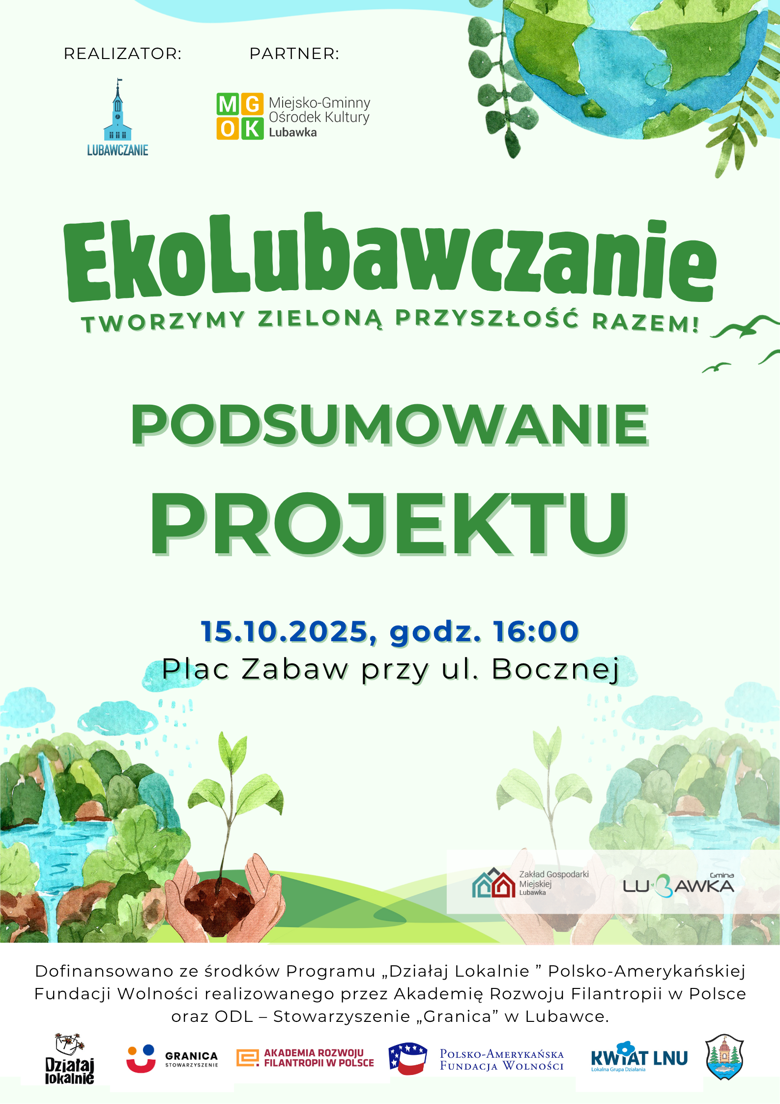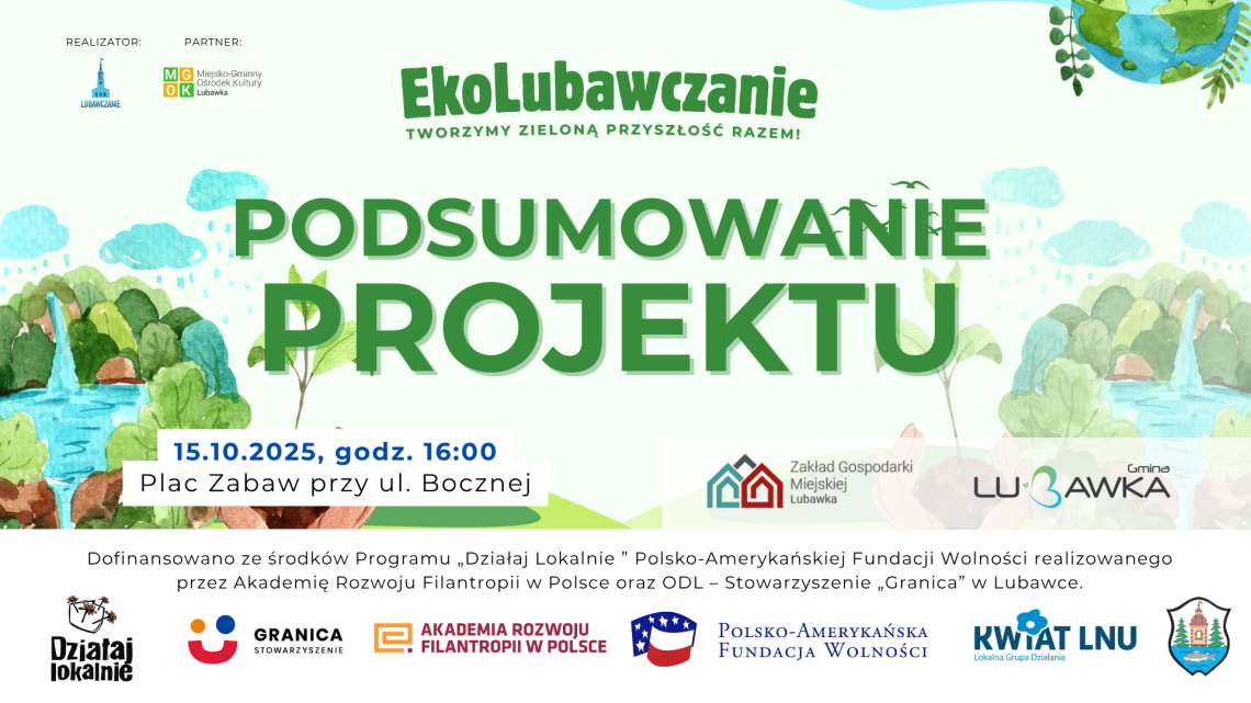 GMINA LUBAWKA. Stowarzyszenie Lubawczanie zaprasza na wydarzenie podsumowujące projekt „EkoLubawczanie – Tworzymy Zieloną Przyszłość Razem!”, które odbędzie się w środę 15 października o godzinie 16:00 na placu zabaw przy ul. Bocznej w Lubawce.