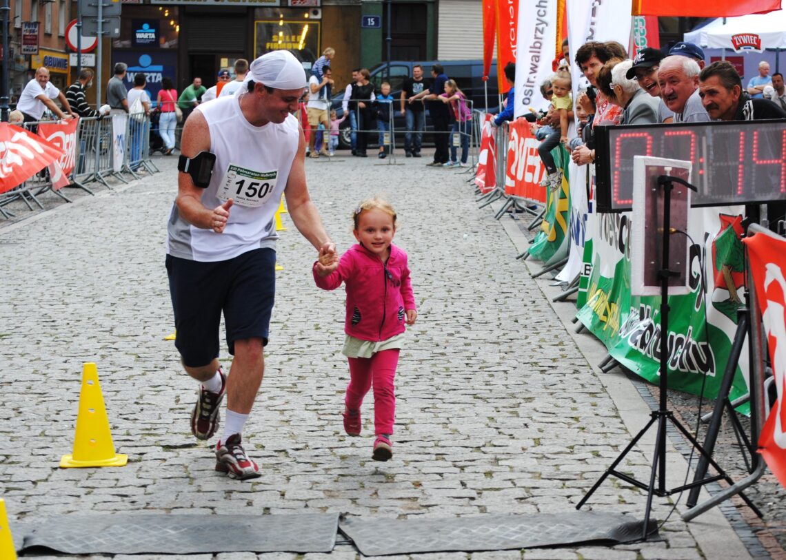 Foto: Kamiennogórzanin Paweł Ruchała na mecie wałbrzyskiego półmaratonu wraz z córką Marysią (2012 r.)