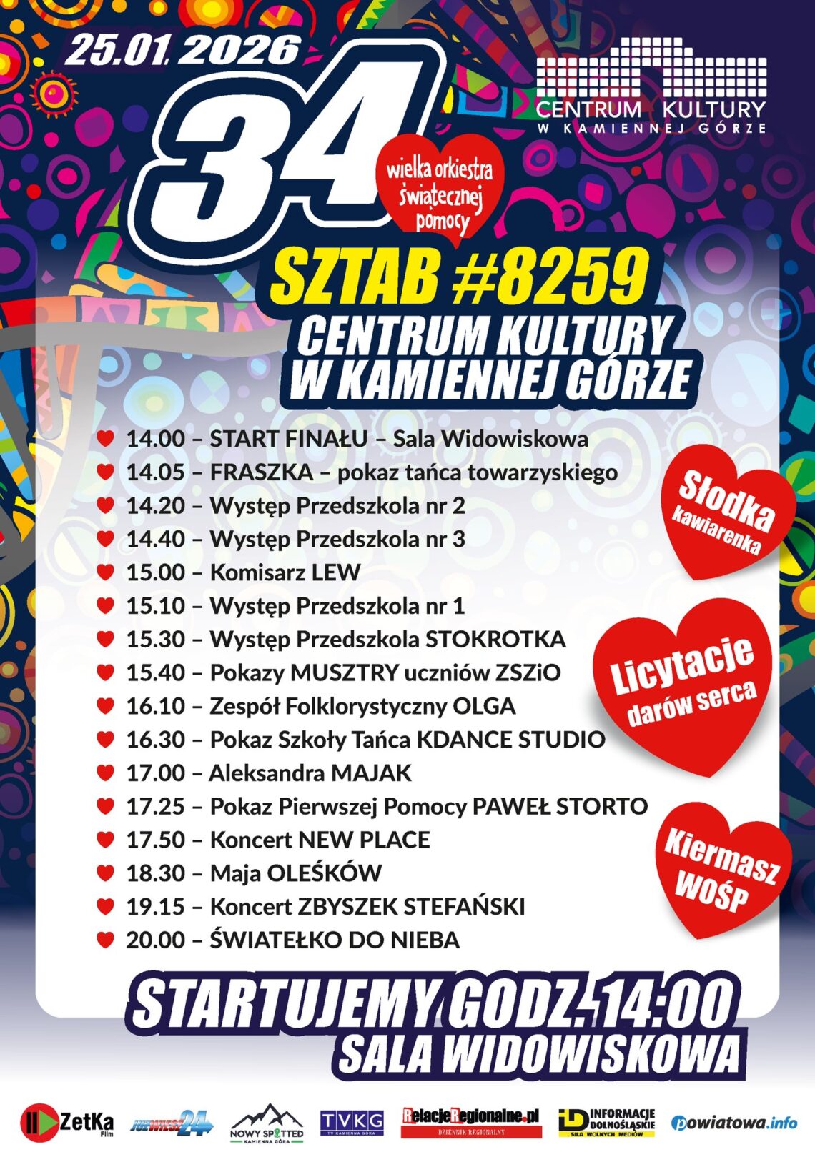 KAMIENNA GÓRA. Centrum Kultury w Kamiennej Górze zaprasza mieszkańców na 34. Finał Wielkiej Orkiestry Świątecznej Pomocy, który odbędzie się w niedzielę 25 stycznia. Wydarzenie rozpocznie się punktualnie o godzinie 14.00 w Sali Widowiskowej.