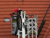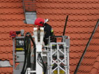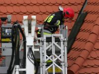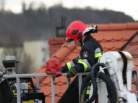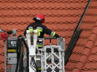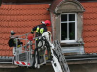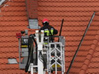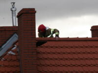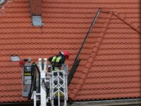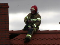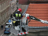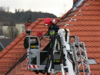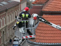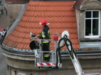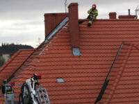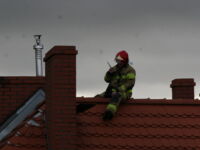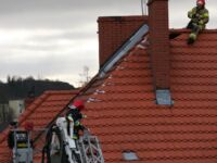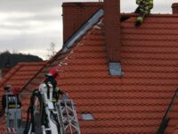 Mieszkaniec sąsiedniego budynku z okna zauważył zerwaną przez wichurę deskę z kominiarskiego podestu, która zawisła na spadzistym dachu. Obawiał się, że spadnie na przechodniów lub przejeżdżające auta, więc wezwał na pomoc strażaków.