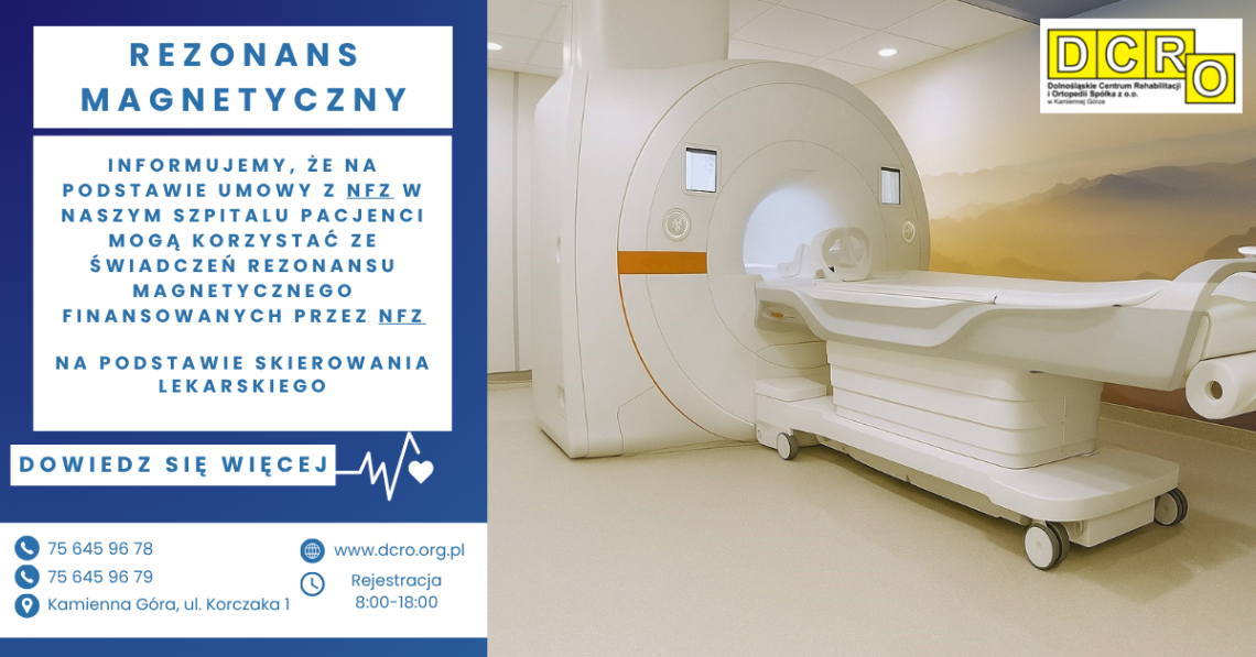 KAMIENNA GÓRA/REGION. Dolnośląskie Centrum Rehabilitacji i Ortopedii w Kamiennej Górze informuje, że na podstawie umowy z Narodowym Funduszem Zdrowia w szpitalu pacjenci mogą korzystać ze świadczeń rezonansu magnetycznego finansowanych przez Narodowy Fundusz Zdrowia, po okazaniu skierowania od lekarza.