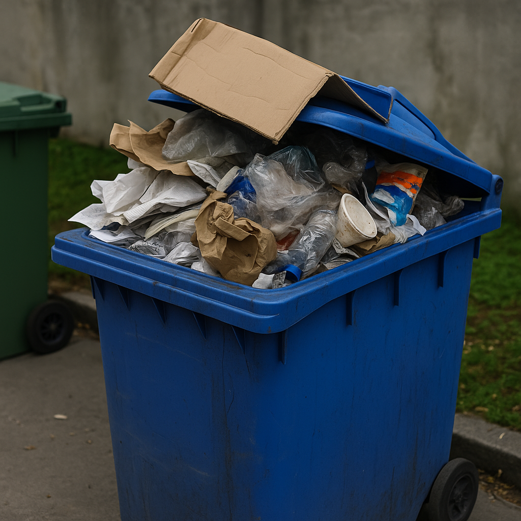 Podczas ostatniego odbioru odpadów z niebieskich pojemników, przeznaczonych na papier, stwierdzono znaczne zanieczyszczenie frakcji. W pojemnikach, zamiast wyłącznie papieru i tektury, znajdowały się m.in. tworzywa sztuczne, odpady bio oraz odpady zmieszane. W efekcie firma odbierająca odpady była zmuszona przekwalifikować cały transport z frakcji „papier” na „odpad zmieszany”.