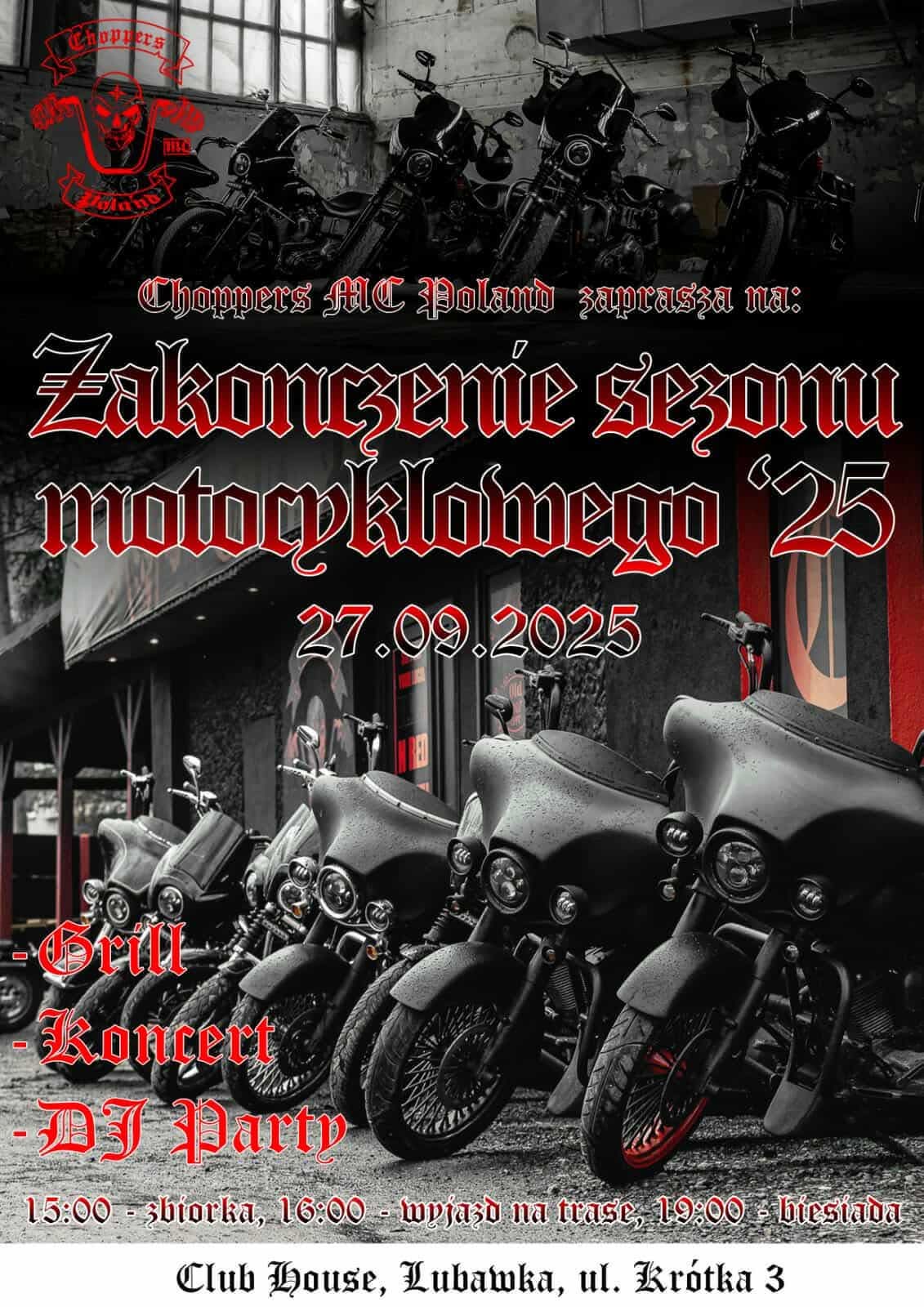LUBAWKA. W sobotę, 27 września, klub motocyklowy Choppers MC Poland zaprasza wszystkich miłośników dwóch kółek na Zakończenie Sezonu Motocyklowego ’25. Impreza odbędzie się przy siedzibie klubu w Lubawce, przy ul. Krótkiej 3.