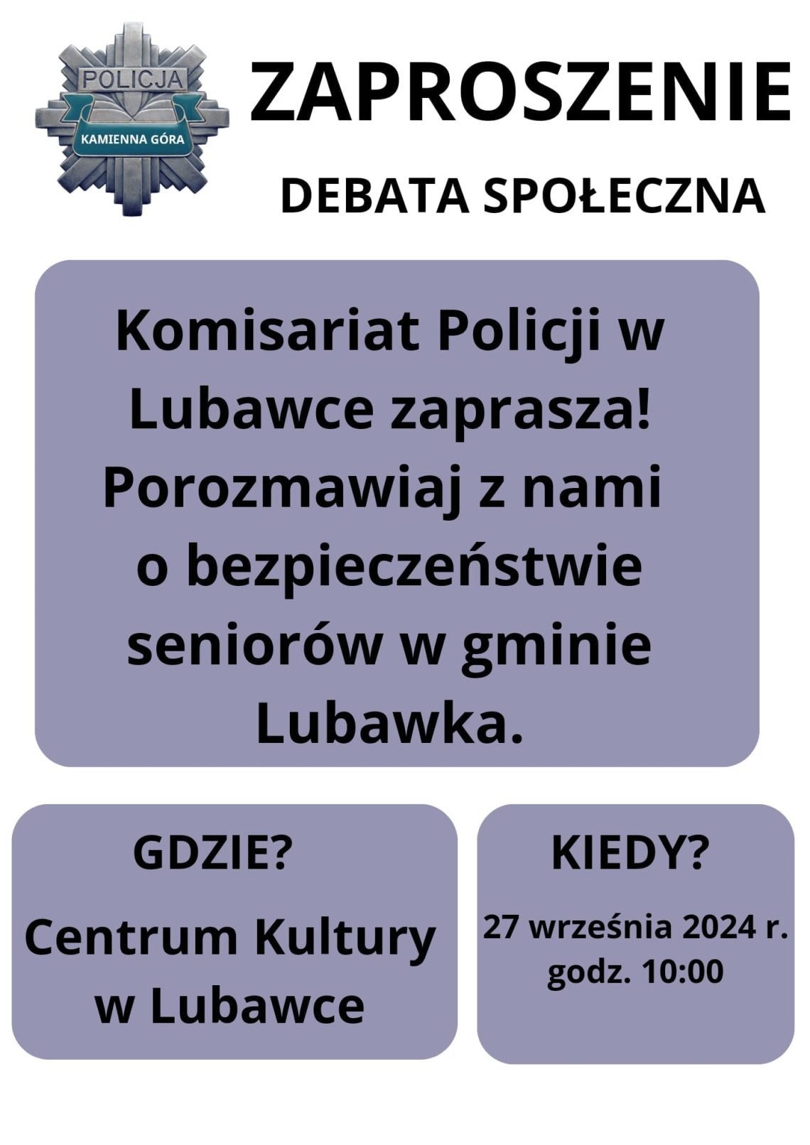 LUBAWKA. Kamiennogórska policja zaprasza do udziału w debacie społecznej poświęconej bezpieczeństwu seniorów w gminie. Spotkanie odbędzie się 27 września o godzinie 10.00 – sala widowiskowa Miejsko-Gminnego Ośrodka Kultury w Lubawce przy Kamiennogórskiej 19.