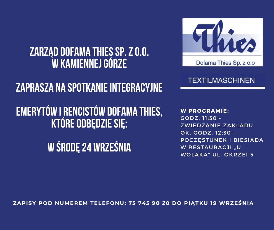 KAMIENNA GÓRA/POWIAT. Zarząd Dofama Thies Sp. z o.o. w Kamiennej Górze zaprasza wszystkich emerytów i rencistów związanych z naszą firmą na wyjątkowe spotkanie integracyjne, które odbędzie się w środę, 24 września.