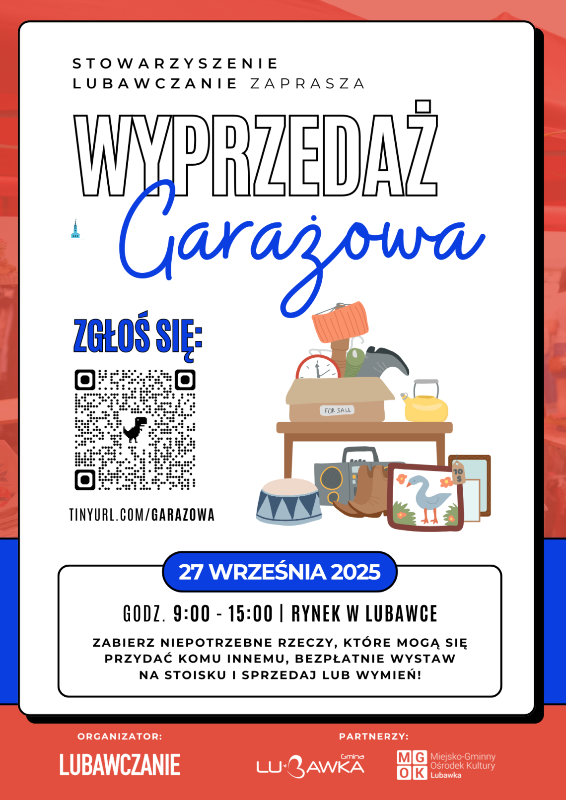 LUBAWKA. Stowarzyszenie „Lubawczanie” zaprasza na pierwszą Wyprzedaż Garażową w Lubawce, która odbędzie się w sobotę 27 września w godzinach 9:00-15:00 na placu Wolności.