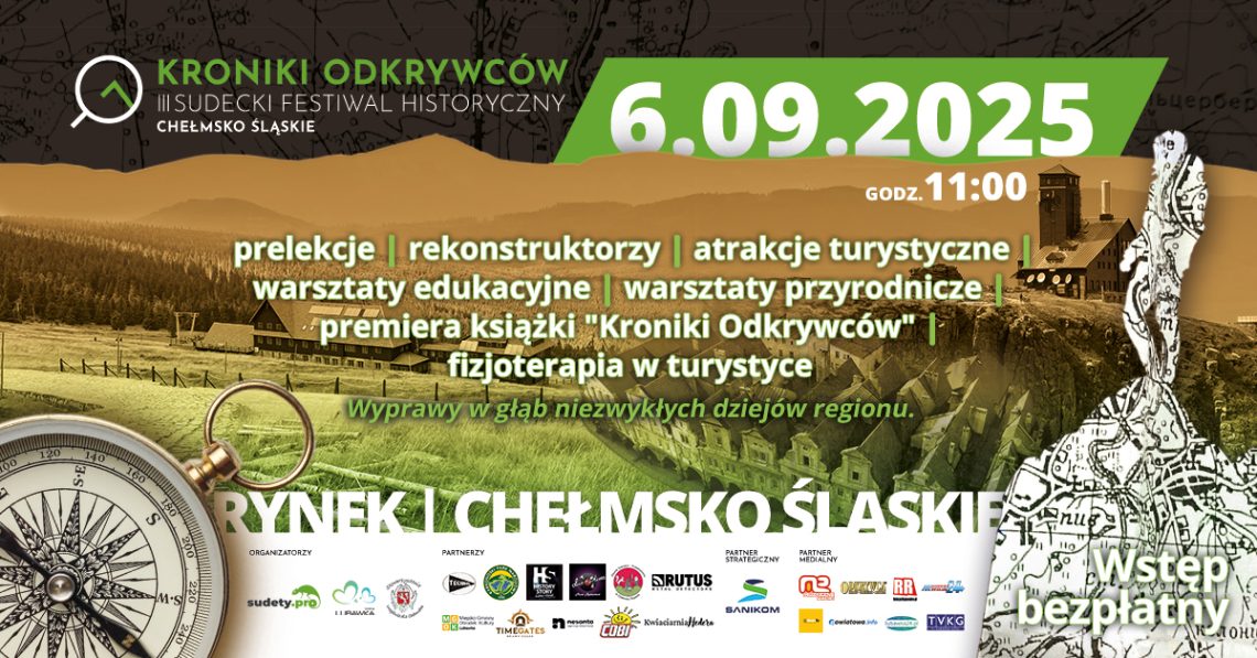 W programie znalazło się również zwiedzanie Chełmska Śląskiego z Adamem Antasem (biletowane, w cenie 45 zł od osoby, rezerwacja w namiocie Sudety.pro). Na uczestników czekają atrakcje turystyczne, stoiska lokalne i literatura. Dla najmłodszych przygotowano kącik edukacyjny z wybuchowymi eksperymentami Time Gates oraz warsztatami przyrodniczymi Karkonoskiego Parku Narodowego.