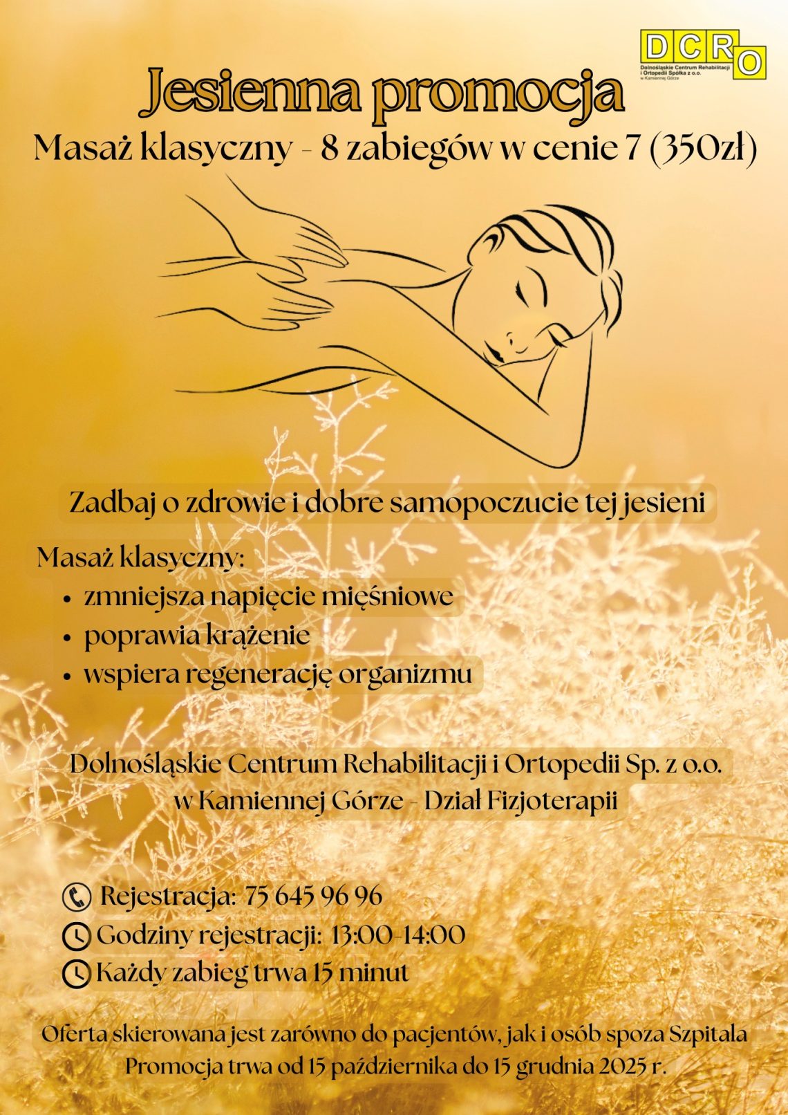 Jesienna promocja w Dolnośląskie Centrum Rehabilitacji i Ortopedii DCRO Sp. z o.o. Kamienna Góra. Zadbaj o swoje ciało i dobre samopoczucie tej jesieni!