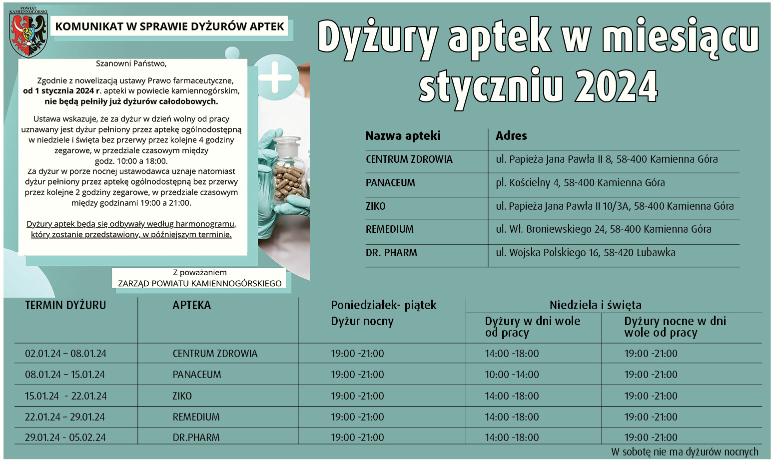 _temat_dnia, Aktualności, Kamienna Góra, Regionalne Komunikat kamiennogórskiego starostwa w sprawie dyżurów aptek w roku 2024 (ts)Podziel się 2 stycznia 2024