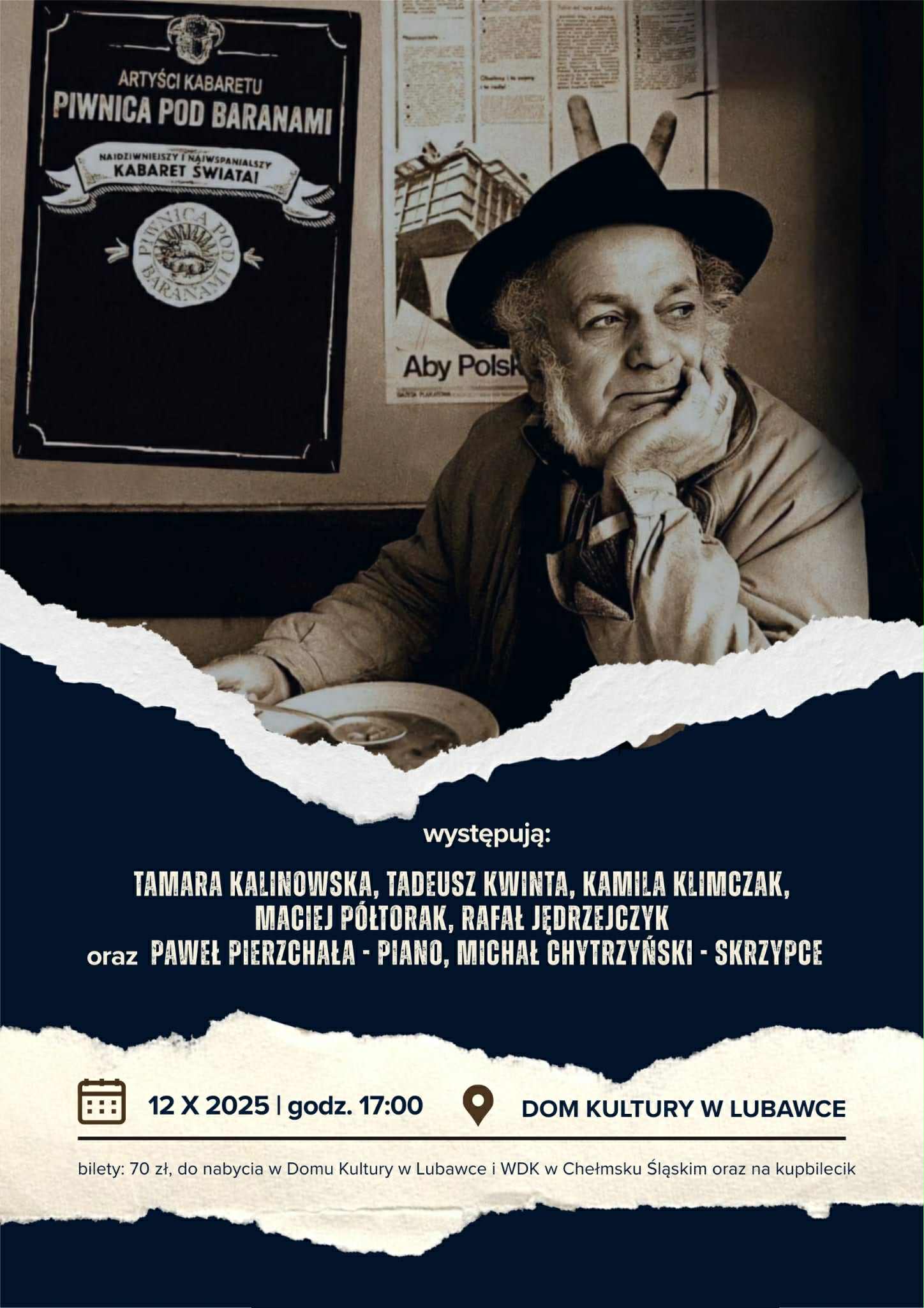– Niezwykłe utwory prosto z krakowskiej, legendarnej Piwnicy. Na deskach  sceny w Domu Kultury w Lubawce będą mogli Państwo zobaczyć i usłyszeć m.in. takich artystów Piwnicy Pod Baranami jak: Tadeusz Kwinta, Tamara Kalinowska, Rafał Jędrzejczyk, Kamila Klimczak, Paweł Pierzchała i Michał Chytrzyński – zaprasza Maciej Półtorak, artysta krakowskiej Piwnicy Pod Baranami, który również wystąpi w Lubawce.