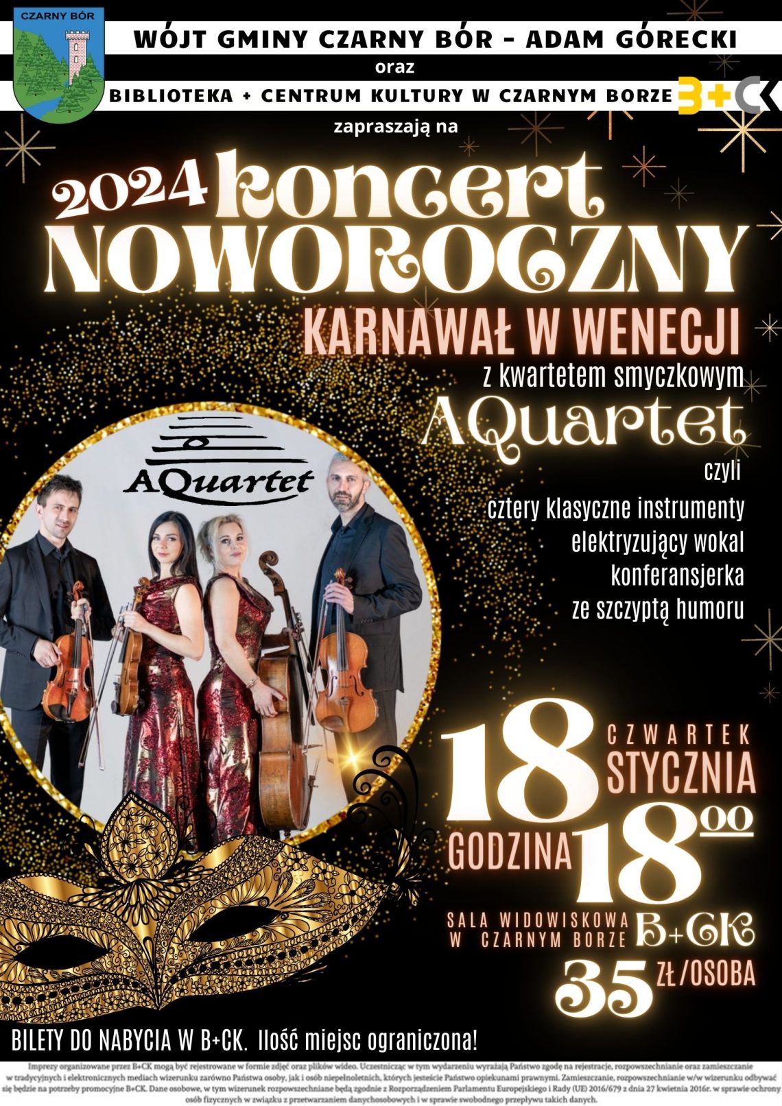 GMINA CZARNY BÓR. Co powiecie na podróż do Wenecji? Nie byliście w Wenecji. Prosto z Czarnego Boru wraz z kwartetem smyczkowym AQuartet popłyniemy muzyko lotem do Italii i odnajdziemy cztery epoki zabawy bez końca. Połączymy się z przeszłością. Odkryjemy tajemnice magicznego miasta.