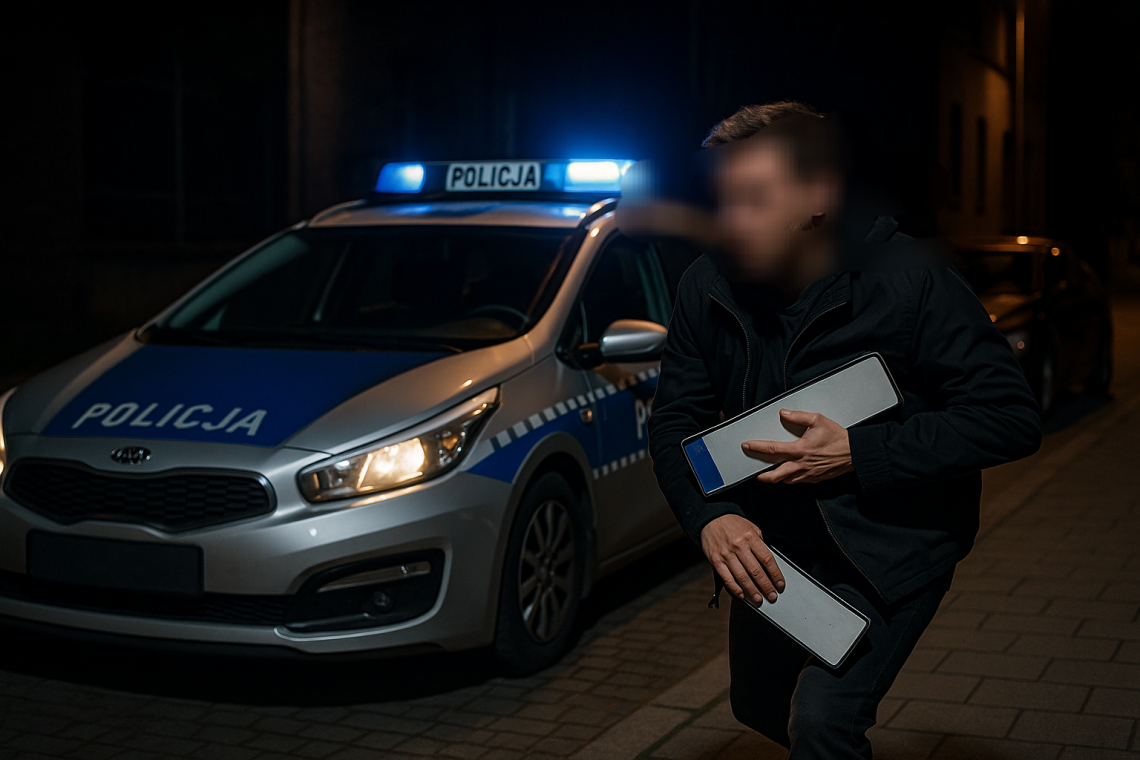 Kiedy policjanci postanowili sprawdzić źródło dźwięku, zauważyli mężczyznę, który właśnie zakończył demontaż tablicy rejestracyjnej z zaparkowanego radiowozu.