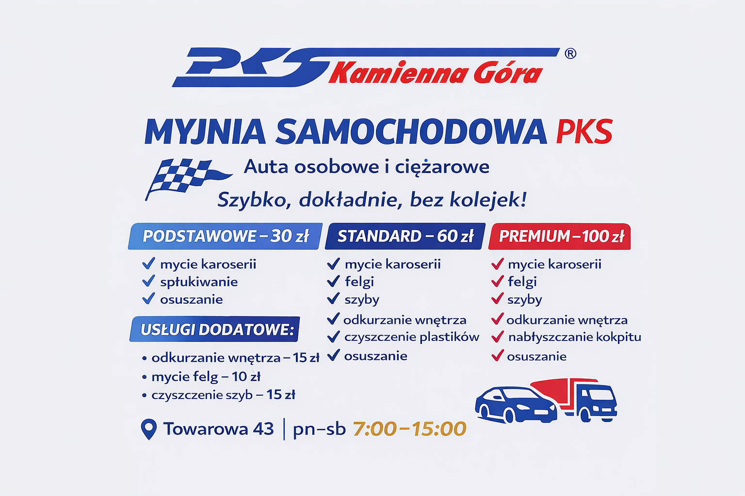 Myjnia samochodowa PKS Kamienna Góra oferuje kompleksowe usługi dla samochodów osobowych oraz dostawczych. Klienci mogą skorzystać z kilku pakietów mycia, dopasowanych do potrzeb i budżetu.