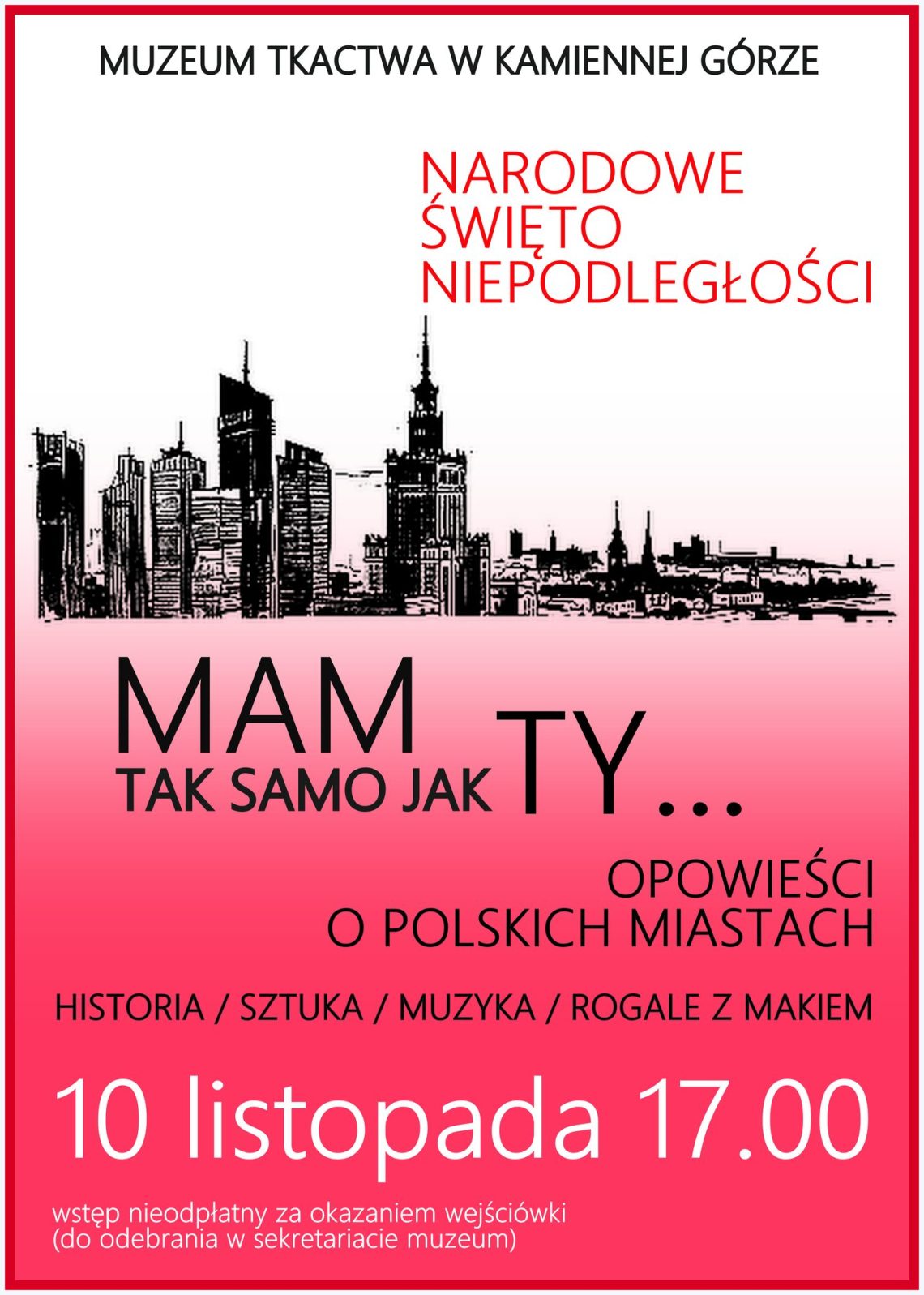 KAMIENNA GÓRA. W poniedziałek, 10 listopada o godz. 17.00, w Muzeum Tkactwa w Kamiennej Górze odbędzie się wydarzenie multimedialne z okazji Narodowego Święta Niepodległości, zatytułowane „Mam tak samo jak Ty… Opowieści o polskich miastach”.