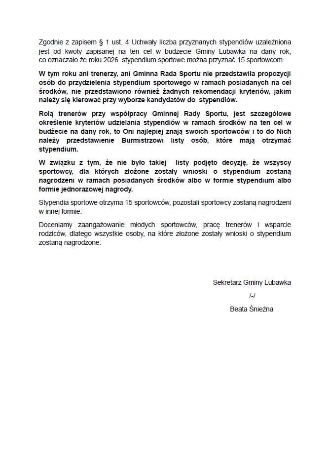 W rozmowie z redakcją sekretarz gminy Beata Śnieżna wskazywała najpierw na ograniczoną pulę środków, a następnie stwierdziła, że w regulaminie nie ma zapisu o randze zawodów jako kryterium decydującym. Po odczytaniu treści regulaminu przyznała jednak, że dokument wskazuje m.in. osiągnięcia sportowe i rangę zawodów jako elementy wpływające na kolejność przyznawania stypendiów.