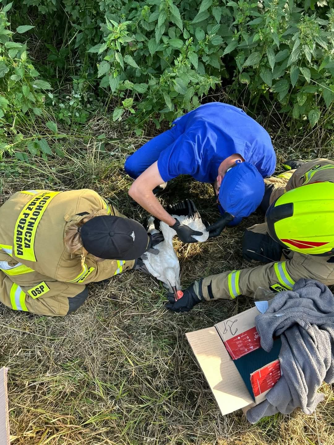 Na miejsce zadysponowano patrol interwencyjny policji oraz strażaków z PSP i OSP. Mundurowi zabezpieczyli ptaka do czasu przyjazdu weterynarza. Po zbadaniu okazało się, że bocian nie odniósł poważnych obrażeń.