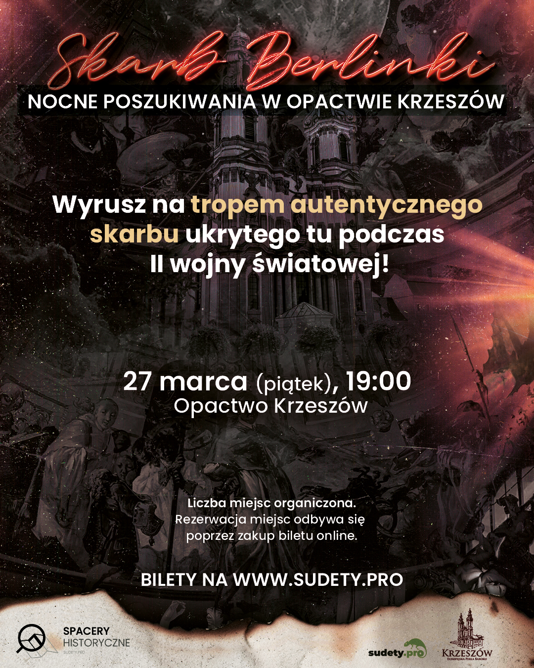 KRZESZÓW. W piątek, 27 marca o godz. 19:00 w Opactwie Krzeszów odbędzie się kolejna odsłona „Nocnych Poszukiwań Berlinki” – cyklicznego wydarzenia, które na dobre wpisało się w kulturalny kalendarz regionu. Wydarzenie jest organizowane przez fundację Europejska Perła Baroku oraz agencję Sudety.pro.