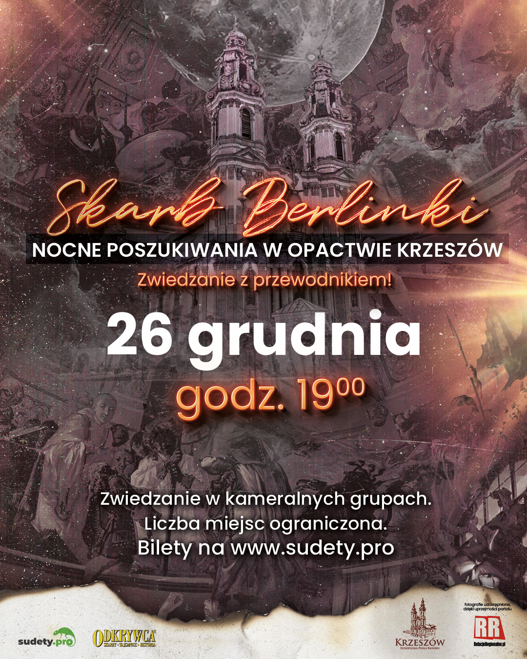 KRZESZÓW. Opactwo Krzeszów ponownie stanie się sceną jednej z najbardziej intrygujących opowieści związanych z historią II wojny światowej. W piątek 26 grudnia odbędzie się kolejna edycja „Nocnych Poszukiwań Skarbu Berlinki” – wydarzenia łączącego zwiedzanie z narracją opartą na jednej z najsłynniejszych legend Dolnego Śląska.