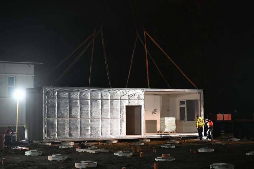 Każdy z montowanych elementów to gotowy moduł konstrukcyjny, który po połączeniu stworzy funkcjonalny obiekt przeznaczony do opieki długoterminowej. Zastosowanie technologii modułowej pozwala znacząco skrócić czas realizacji inwestycji, przy jednoczesnym zachowaniu wysokich standardów jakości i bezpieczeństwa.