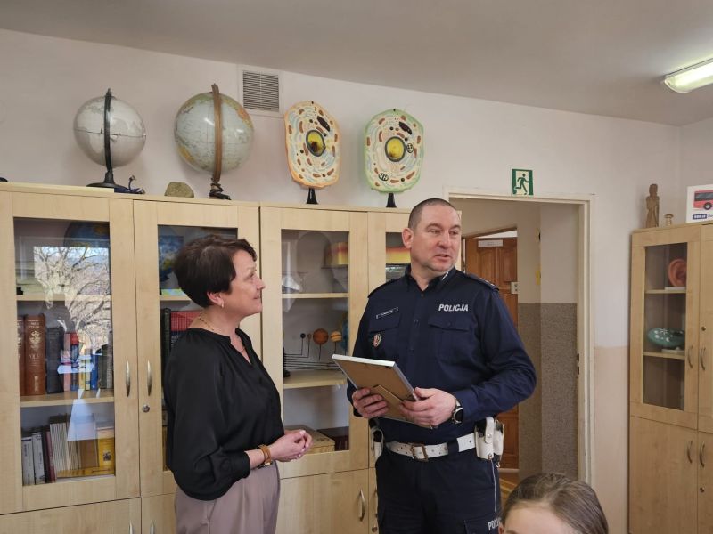 Podczas spotkania policjanci otrzymali również podziękowania za współpracę przy realizacji konkursu oraz za działania profilaktyczne prowadzone w szkole.