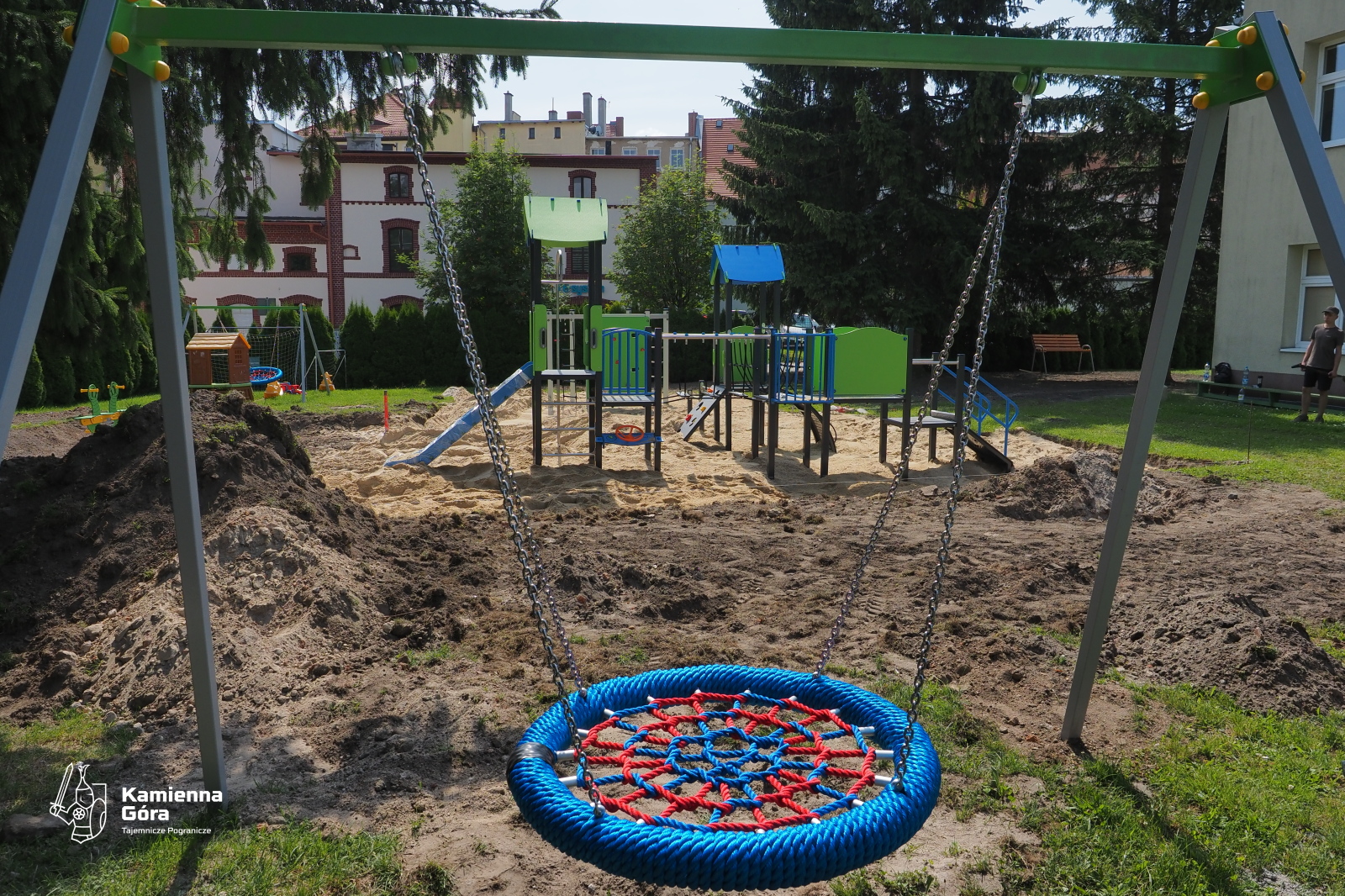 KAMIENNA GÓRA. W ogrodzie Przedszkola Publicznego nr 1 im. Czterolistnej Koniczynki w Kamiennej Górze kończą się prace przy montażu nowego placu zabaw.