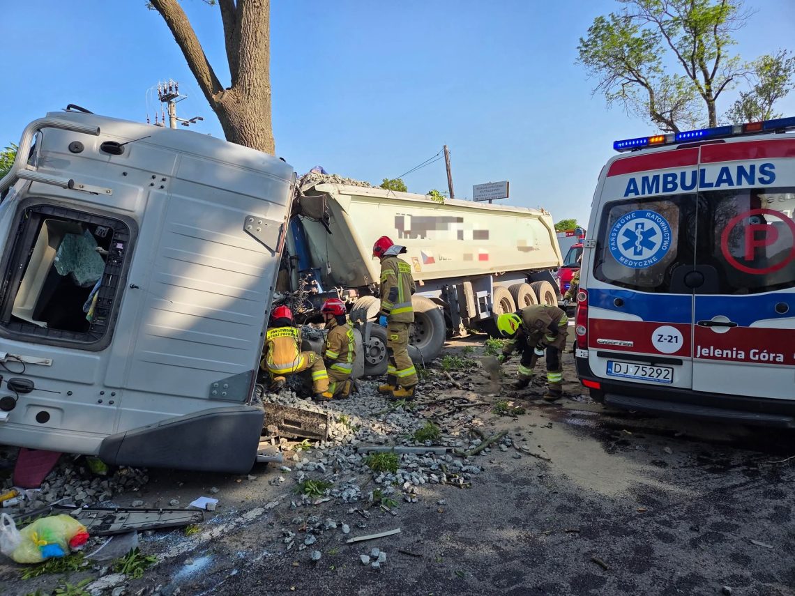 W wyniku zdarzenia poszkodowany został kierowca pojazdu. Na miejscu pracują służby ratunkowe – straż pożarna, zespół ratownictwa medycznego oraz policja. Akcja wciąż trwa.