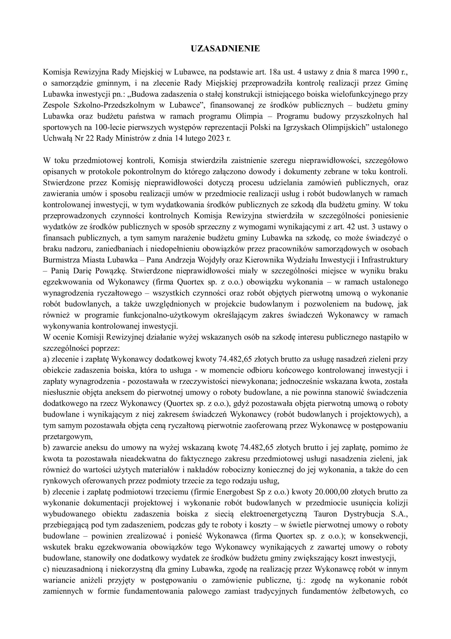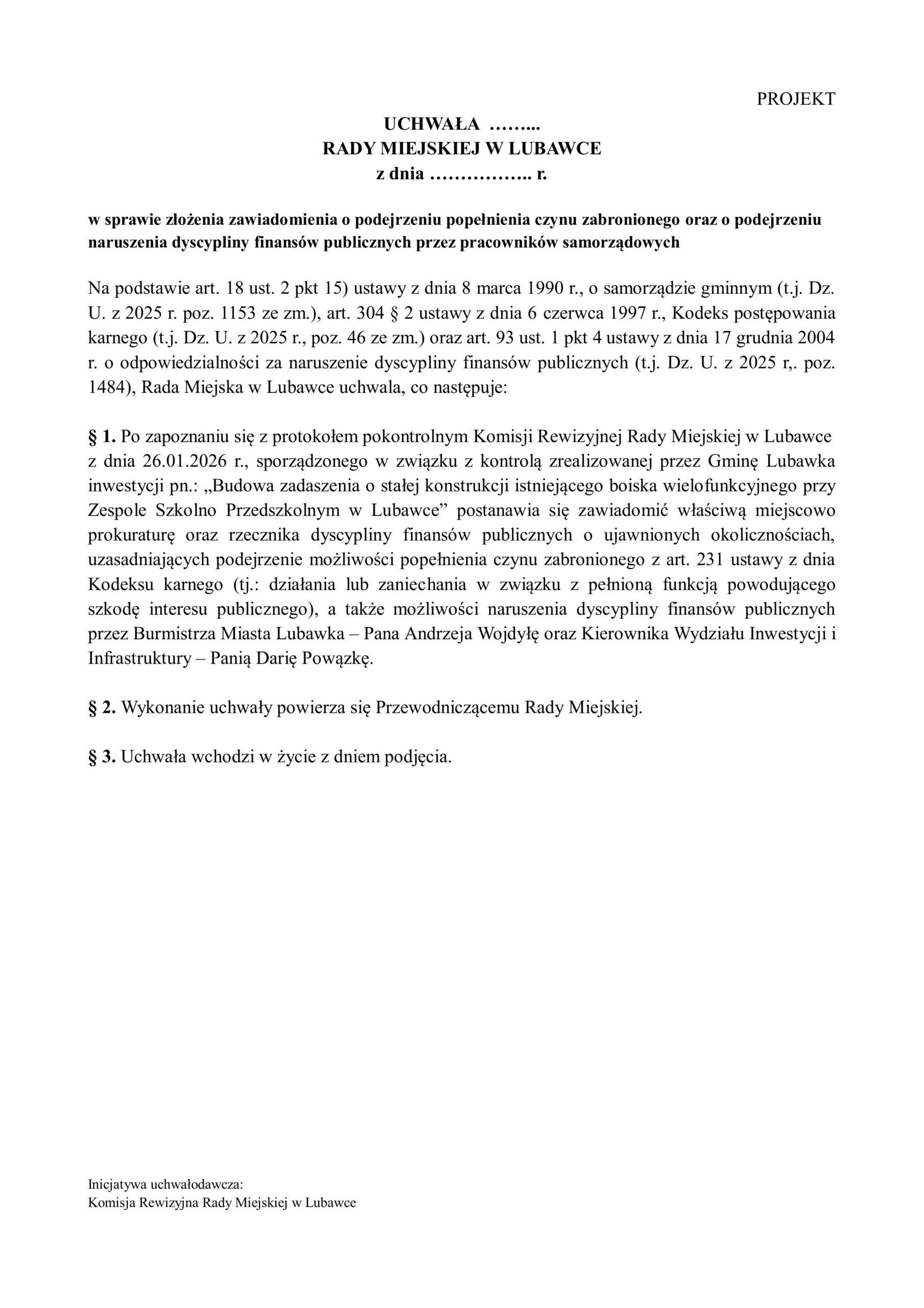 W uchwale wskazano, że podejrzenia dotyczą działań burmistrza Andrzeja Wojdyły oraz kierownik Wydziału Inwestycji i Infrastruktury Darii Powązki. Zawiadomienie ma umożliwić właściwym organom zbadanie sprawy i ocenę, czy doszło do naruszenia prawa oraz dyscypliny finansów publicznych.