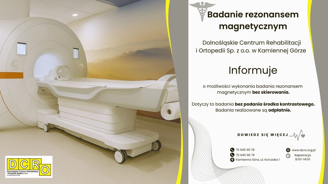 KAMIENNA GÓRA. Dolnośląskie Centrum Rehabilitacji i Ortopedii DCRO sp zoo Kamienna Góra informuje, że istnieje możliwość wykonania badania rezonansu magnetycznego bez skierowania – w trybie komercyjnym (odpłatnie, zgodnie z cennikiem).