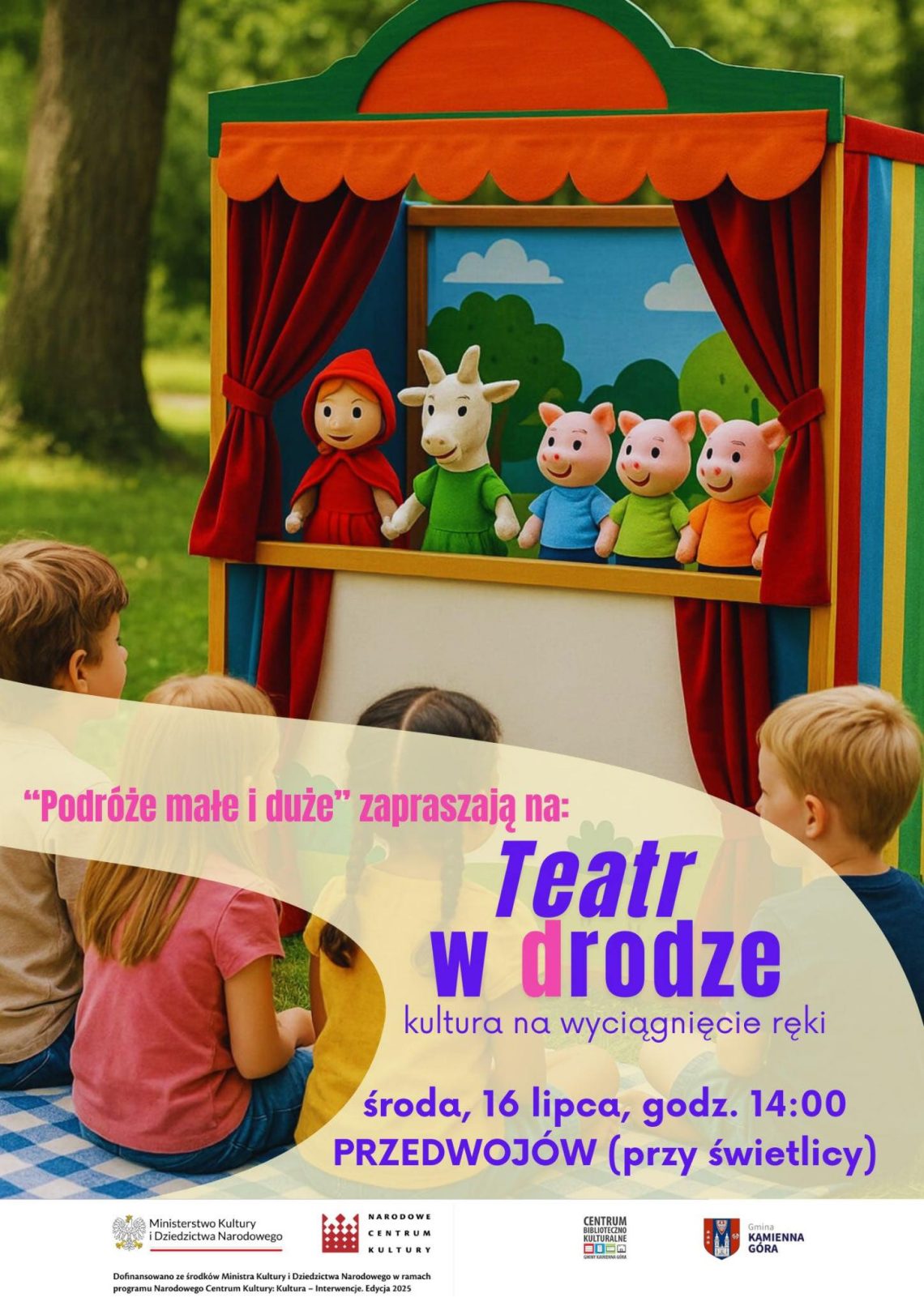 PRZEDWOJÓW/GMINA KAMIENNA GÓRA. W środę, 16 lipca o godzinie 14:00 w Przedwojowie odbędzie się plenerowy pokaz w ramach projektu „Teatr w drodze – kultura na wyciągnięcie ręki”. Spektakl z cyklu „Podróże małe i duże” zostanie zaprezentowany przy świetlicy wiejskiej.