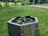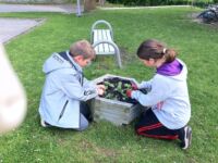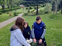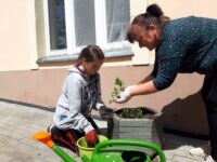 Uczniowie przygotowali pojemniki na kwiaty, usunęli starą ziemię i napełnili nową z kompostu szkolnego. W gazonach umieścili sadzonki słonecznika i sadzonki cynii, wyhodowane z nasion przywiezionych z Wami i Mazur. Podlewając gazony, młodzi ogrodnicy stwierdzili, że jest ogromna inwazja ślimaków i mrówek. Uczniowie będą doglądać roślin, aż wyrosną i zakwitną.