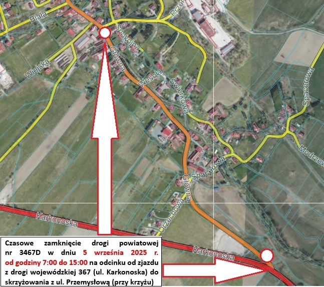 W piątek 5 września 2025 roku w godzinach od 7:00 do 15:00 zamknięta dla ruchu będzie ul. Główna na odcinku od zjazdu z drogi wojewódzkiej nr 367 do skrzyżowania z ul. Przemysłową, tzw. „skrzyżowania przy krzyżu”.