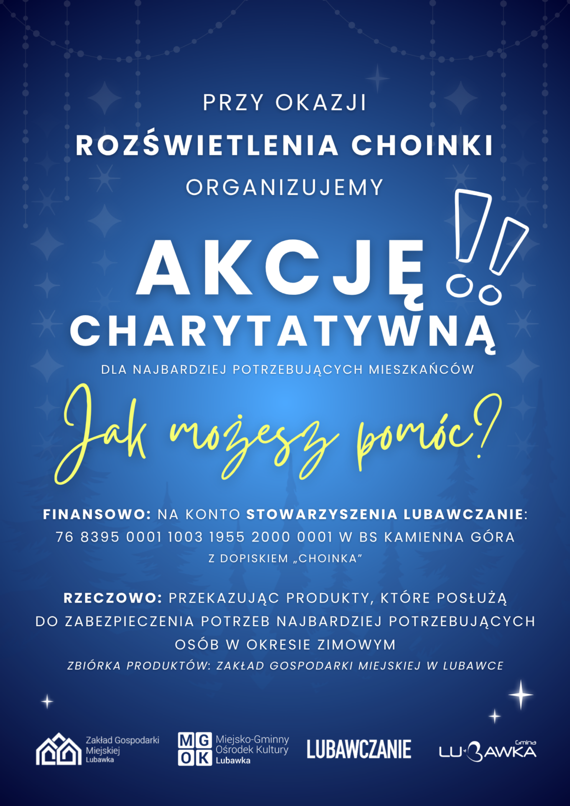 Organizatorzy, we współpracy ze Stowarzyszeniem Lubawczanie, Miejskim Ośrodkiem Kultury i Biblioteką w Lubawce oraz Zespołem Szkolno-Przedszkolnym w Lubawce, po raz kolejny kierują uwagę na potrzebę wsparcia najbardziej potrzebujących mieszkańców gminy.