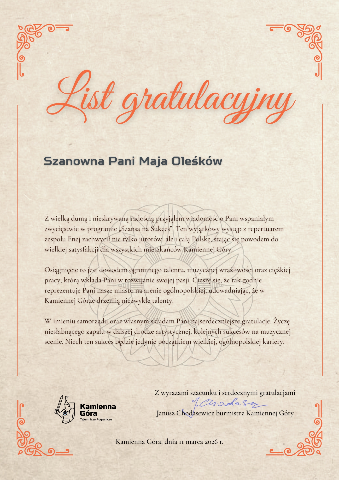 KAMIENNA GÓRA. Burmistrz Janusz Chodasewicz spotkał się z Mają Oleśków – młodą wokalistką z naszego miasta, która niedawno zwyciężyła w programie „Szansa na Sukces. Opole 2026”. Artystka zachwyciła jury interpretacją utworów zespołu Enej i tym samym zapewniła sobie udział w wielkim finale programu.