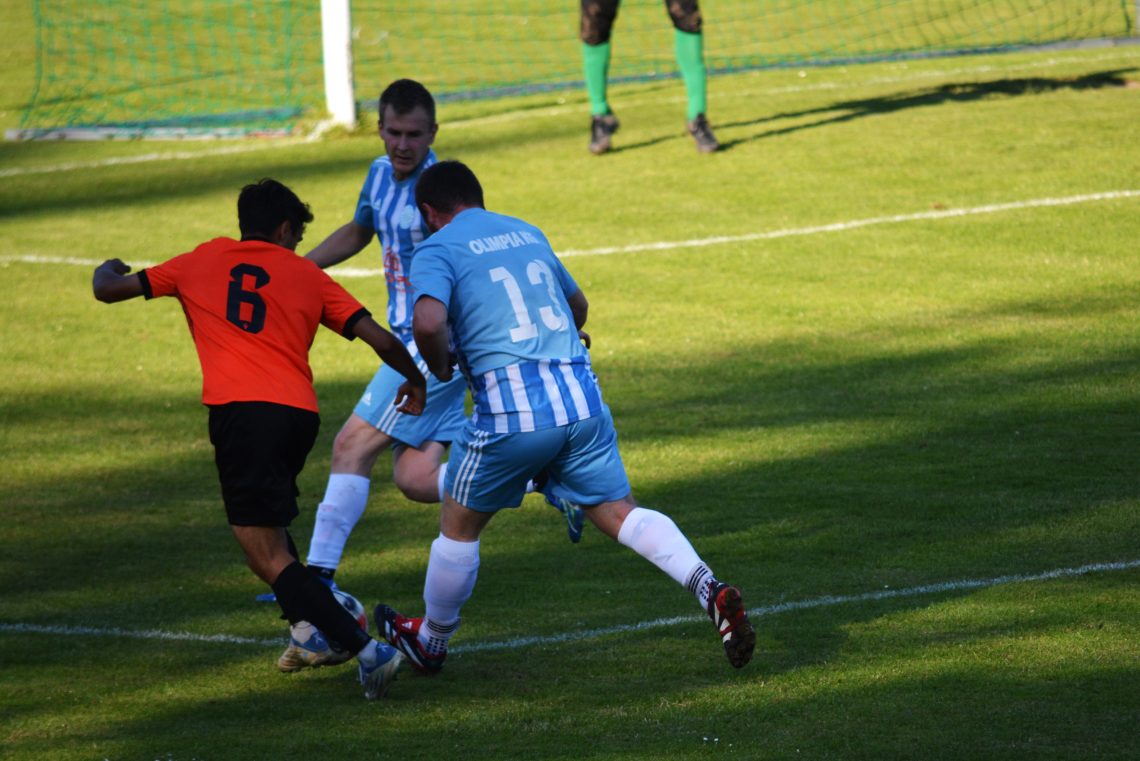 Podopieczni Łukasza Bieńkowskiego wyszli bardzo zmotywowani na sobotni mecz i przez 30 grali bardzo ambitnie, lecz nieskutecznie. Pierwsza akcję oskrzydlającą przeprowadził Bieniek, który w tempo zagrał do Piekarczyka, jednaj popularny „Gutek” nieczysto trafił w piłkę. Pod druga bramką strzał Moczały zatrzymał Jakub Kraszewski. W 11. minucie Piekarczyk dostał dobre podanie i wyszedł sam na sam z bramkarzem gości, jednak nasz napastnik trafił w golkipera. W kolejnej akcji gospodarzy Bieniek przedarł się prawym skrzydłem, lecz w najważniejszym momencie zabrakło precyzji. W 27. minucie Kak miał wymarzoną okazję, niestety pomocnik Olimpii trafił w bramkarza. To się szybko zemściło. Po dwóch kwadransach Łukasz Kraszewski za krótko wybił futbolówkę. Dopadł do niej Moczała i przy pomocy słupka otworzył wynik spotkania na 0:1. Przyjezdni jeszcze do przerwy zadali drugi cios Olimpii. Kamiennogórzanie wypracowali swoją kolejną okazję pod koniec inauguracyjnej odsłony, lecz Piekarczyk ponownie przegrał bój z bramkarzem lidera. Niestety pod koniec pierwszej odsłony przyjezdni oddali drugi strzał i podwyższyli wynik spotkania na 0:2. Do notesu trenera wpisał się Skiba. W drugiej połowie tempo gry znacznie siadło. Ekipa Twardego nie naciskała, ale wykorzystało kolejne trzy okazje bramkowe. Niestety nasz blok defensywny przypominał bardziej dziurawy szwajcarski  ser. Na listę strzelców wpisali się kolejno: Moczała, Łojko i Skiba.